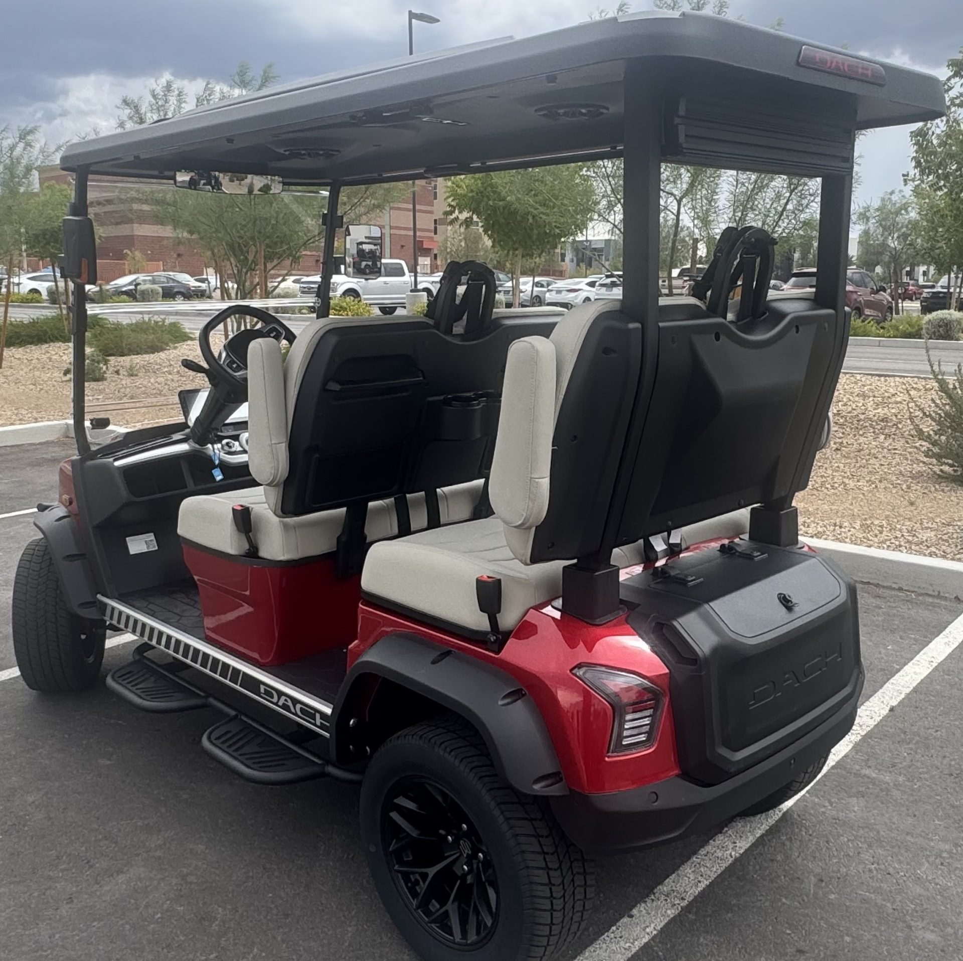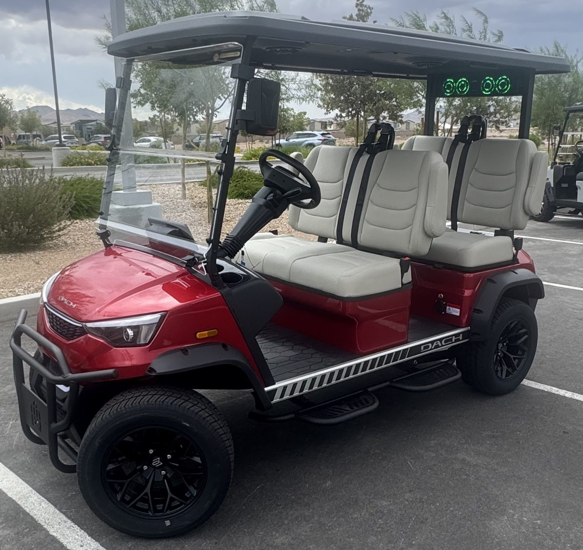 2025 DACH APOLLO! Red with Beige interior. This is one of the best carts for the bang! This cart is a 72v motor when most are only 48. This has longer more efficient range and is a powerhouse with extra passengers and hills. This cart comes fulllllllllly loaded. Sound Bar, Roof speakers that color change, LED color changing lights, Side steps, Brush guard, Apple car play, Keyless start with your phone. LSV street legal with a 17-digit vin number. 8 exterior colors, 4 standard interior colors and 4 upgraded interior color options with MODZ seat skins, 2-wheel options and 2 tire options. We have every color combo on order. Stop in to be one of the first to have one of these bad boys! 0% for 36 months or only 5.99% for 60 months. Trades welcome! We buy carts as well. We include a LIFETIME battery warranty with all new cart purchases SINCITYGOLFCARS.COM 702-SIN-CITY 3720 E. DALE AVE. HENDERSON, NV 89044