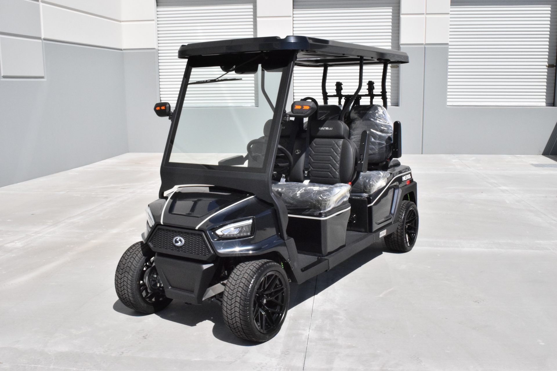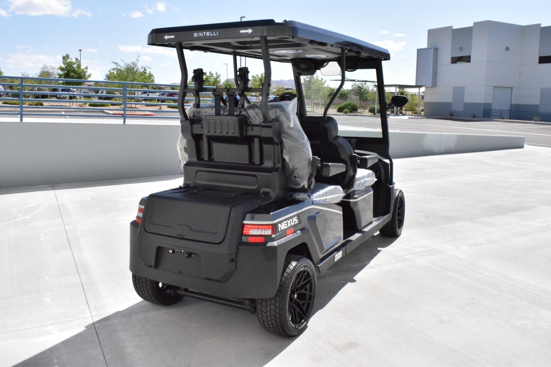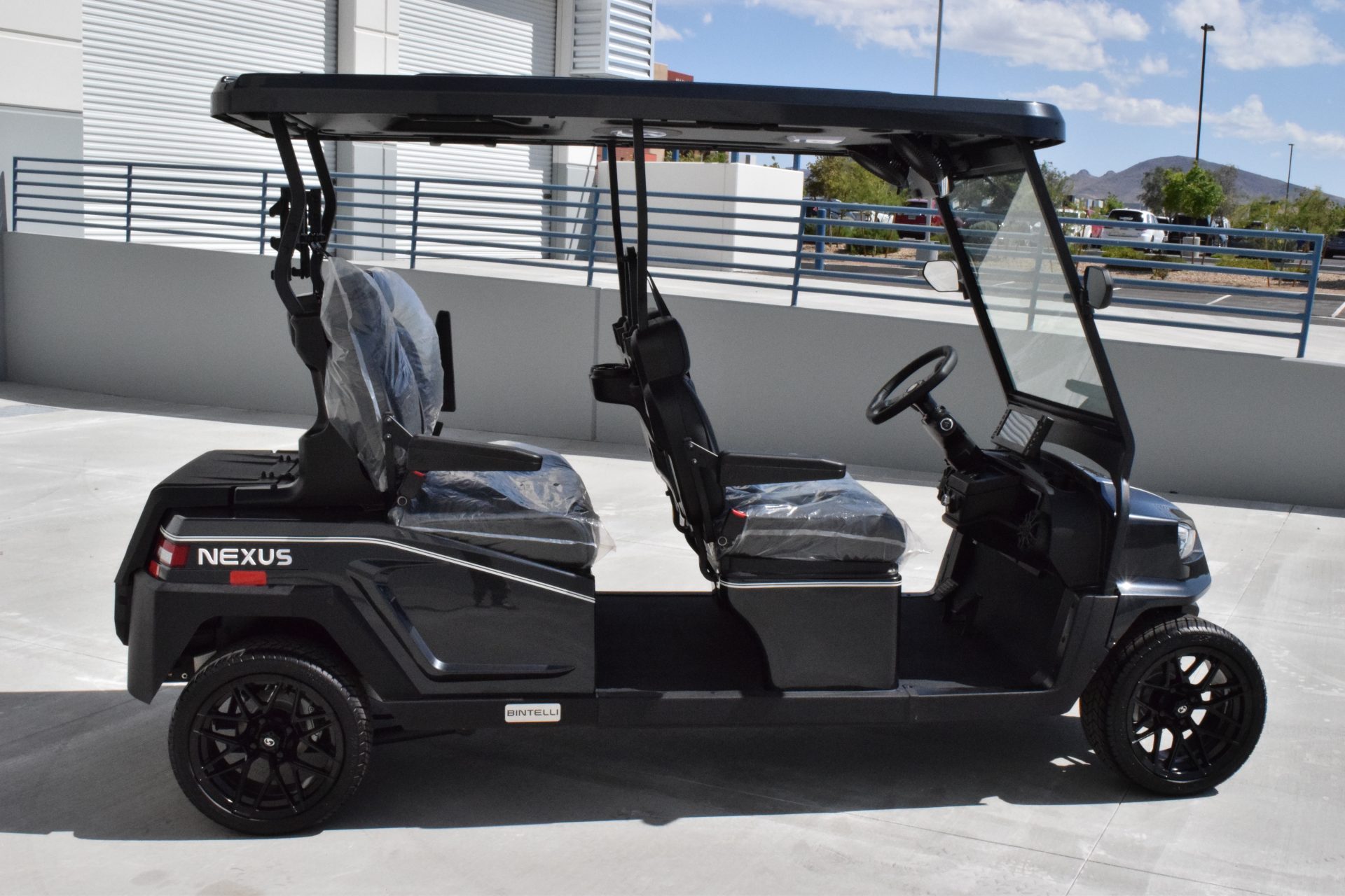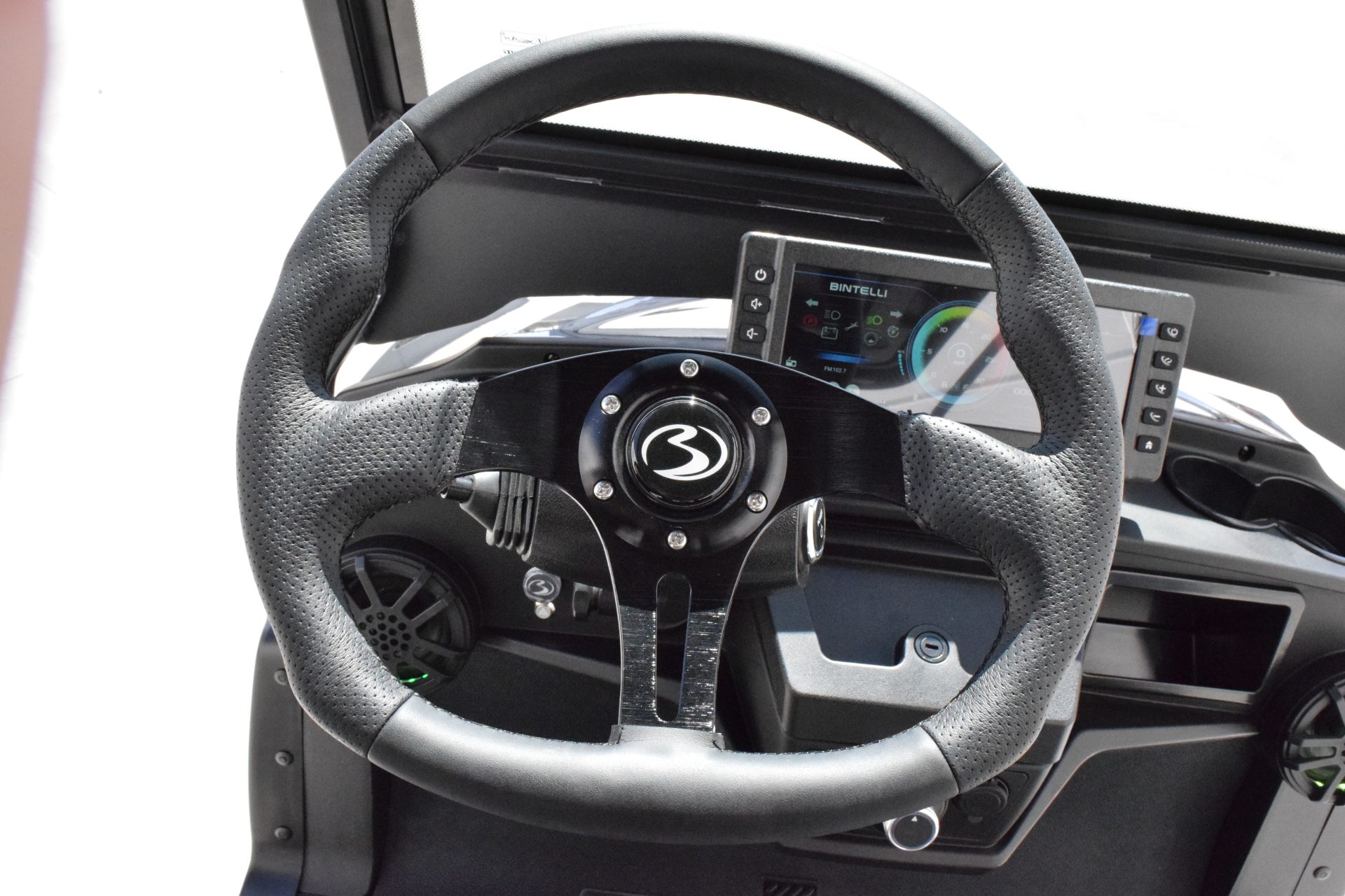 The Nexus is powered by a range-extended 72v drive system and is packed with more standard features than any other cart at its price point. Complete with a 13″ high-res infotainment center, roof-mounted fans, lights, and speakers, a beach chair holder, LED accent lighting, and lockable storage. The Gen2 adds power steering, adjustable camber, color-changing under mounted lights, push-button start, and so much more… be prepared to be the talk of your neighborhood with the all-new Bintelli Nexus!