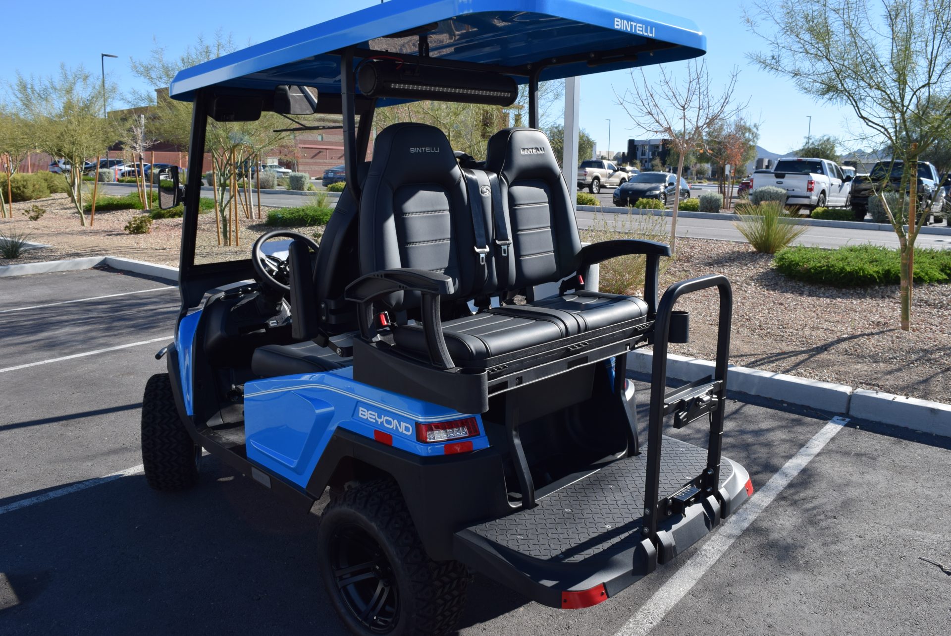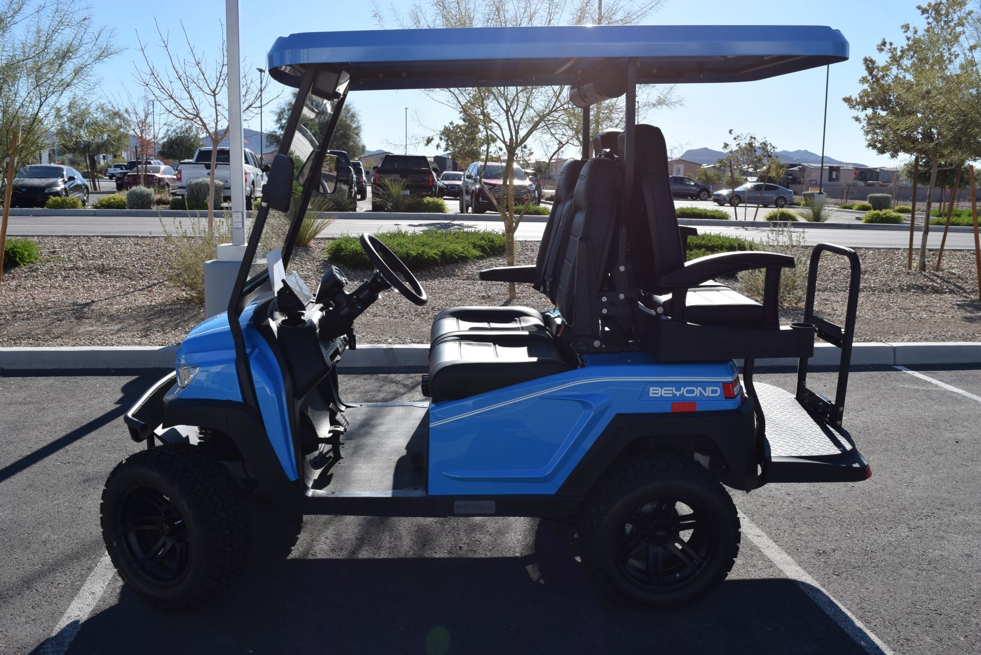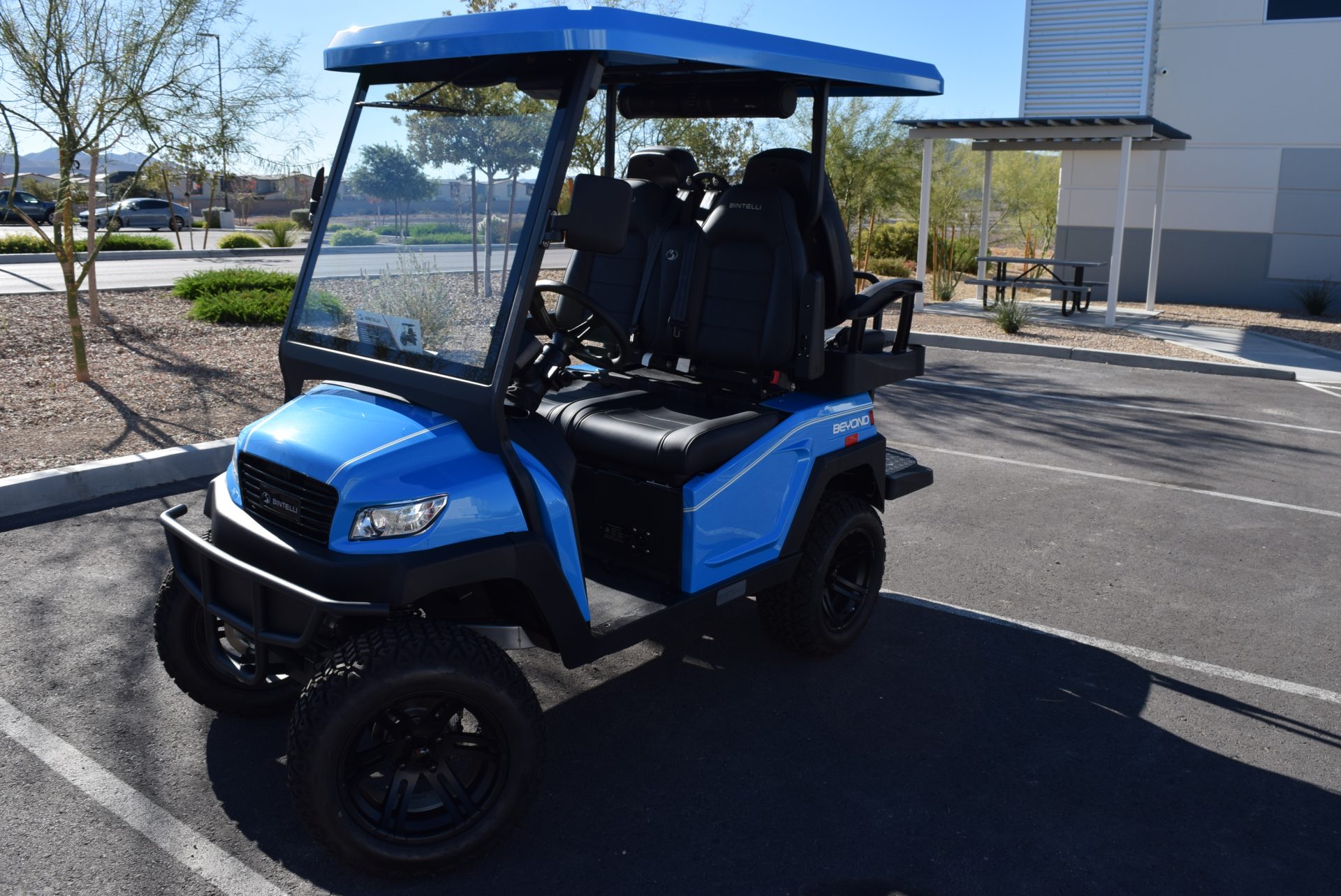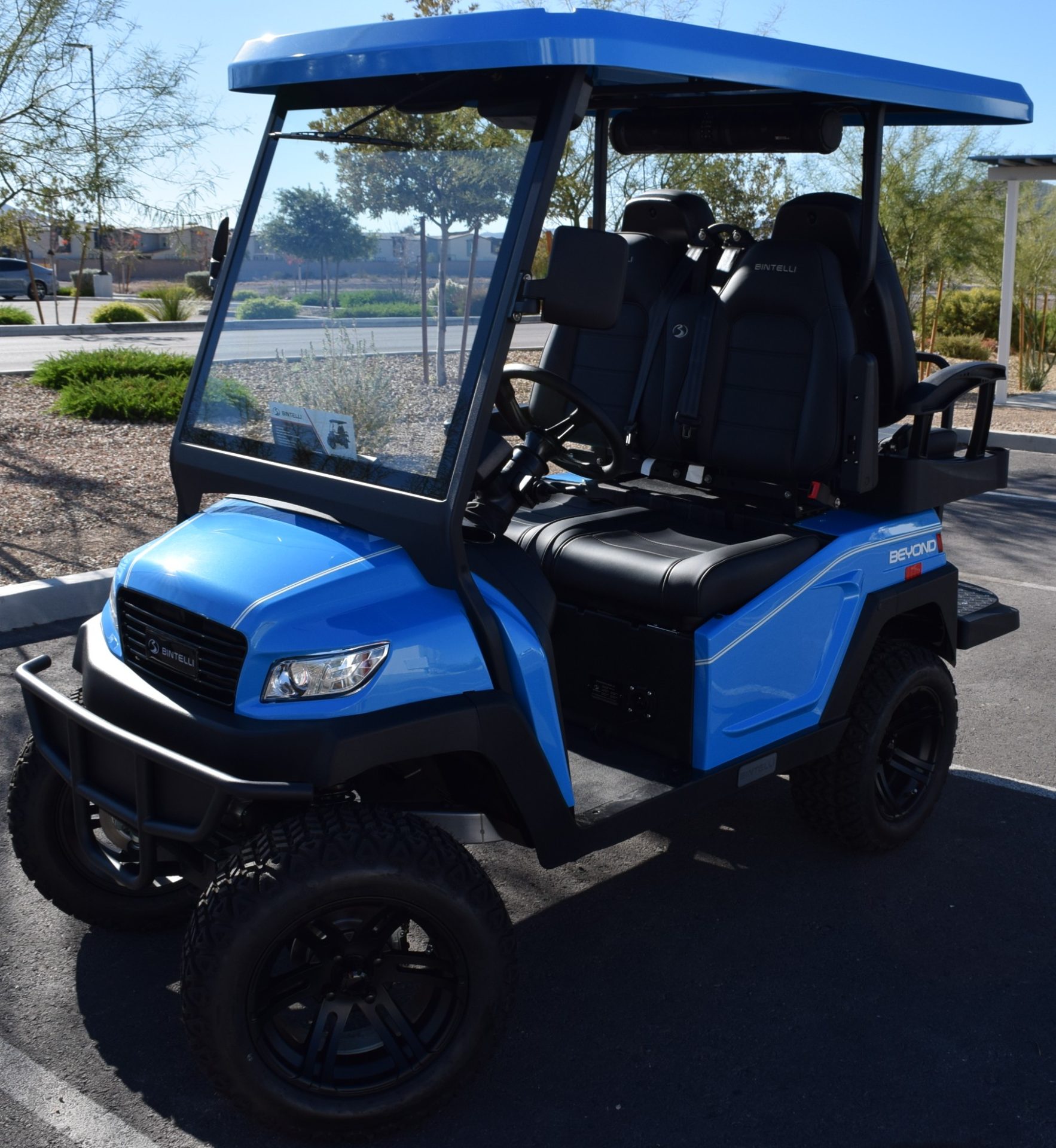 2026 Bintelli Beyond 4p Lifted Street legal golf cart in Ocean Blue with Black interior. Bintelli is an award-winning brand of golf carts and LSVs.