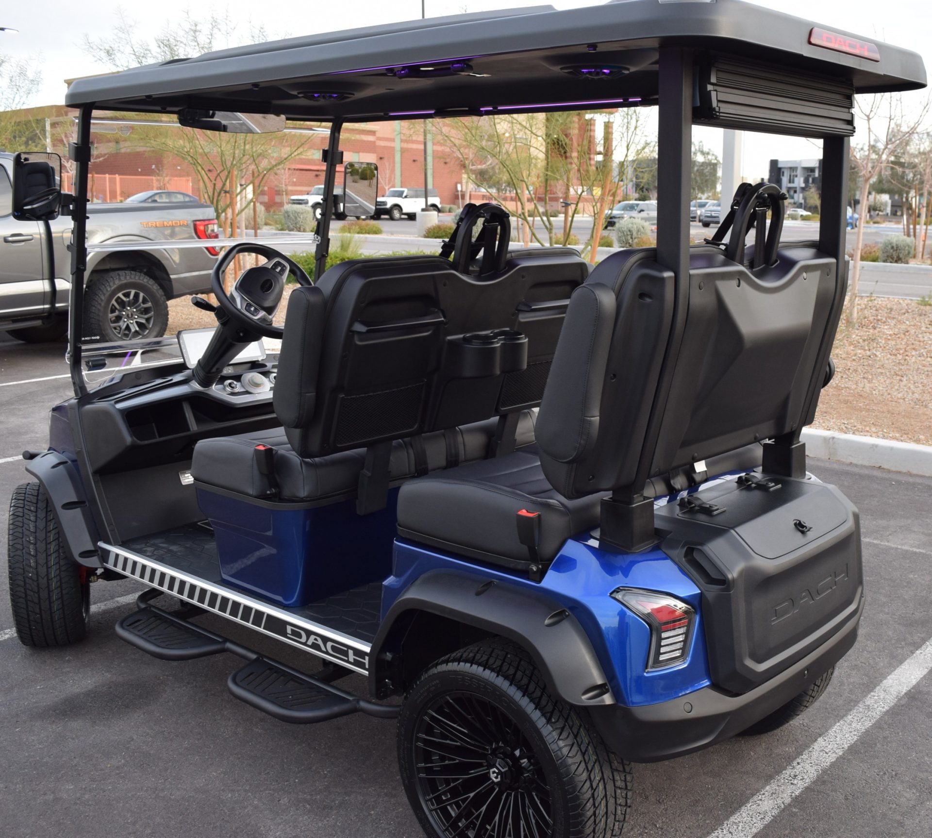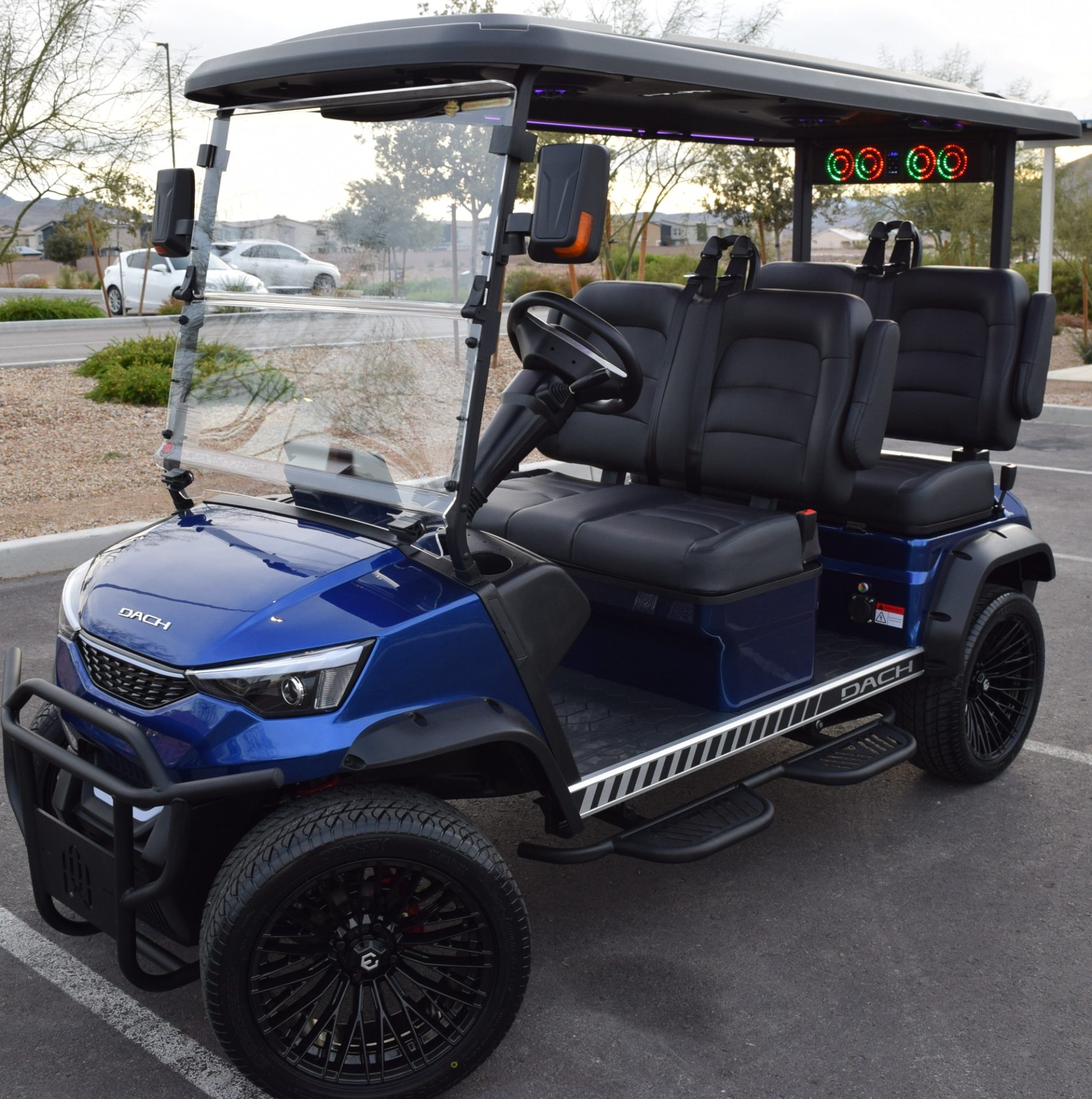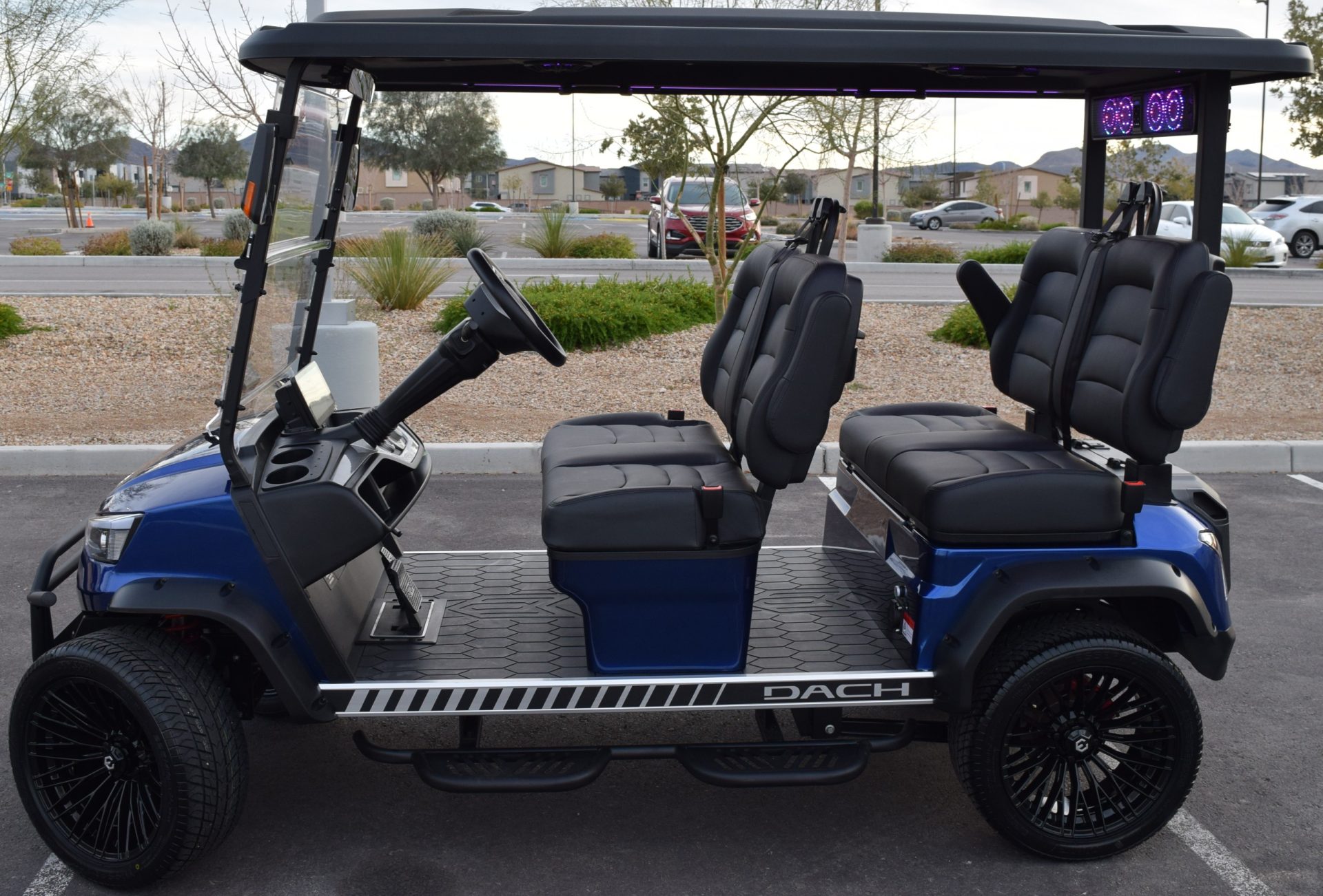 2026 Dach Apollo Custom! Blue with Black Interior, Modz Reaper 16 in gloss black wheels and 16-inch tires! This is one of the best built carts around! This cart is a 72v motor when most are only 48. This has longer more efficient range and is a powerhouse with extra passengers and hills. This cart comes fulllllllllly loaded. Sound Bar, Roof speakers that color change, LED color changing lights, Side steps, Brush guard, Apple car play, Keyless start with your phone. LSV street legal with a 17-digit vin number. 8 exterior colors, 4 standard interior colors and 4 upgraded interior color options with MODZ seat skins, 2-wheel options and 2 tire options. We have every color combo on order. Stop in to be one of the first to have one of these bad boys! 0% for 36 months or only 5.99% for 60 months. Trades welcome! We buy carts as well. We include a LIFETIME battery warranty with all new cart purchases SINCITYGOLFCARS.COM 702-SIN-CITY 3720 E. DALE AVE. HENDERSON, NV 89044 Voted the best golf cart dealership in Las Vegas